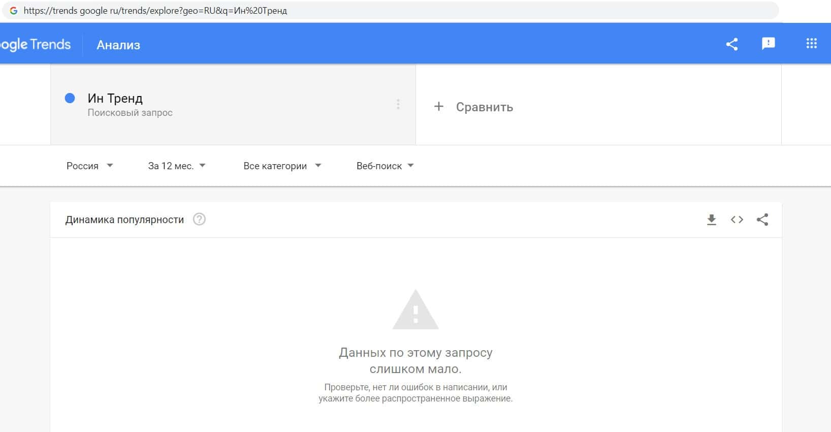 Ещё мы проверили количество запросов компании финансовых аферистов ИнТренд по русскоязычному названию с пробелом, а именно "Ин Тренд". Но результат - нулевой.