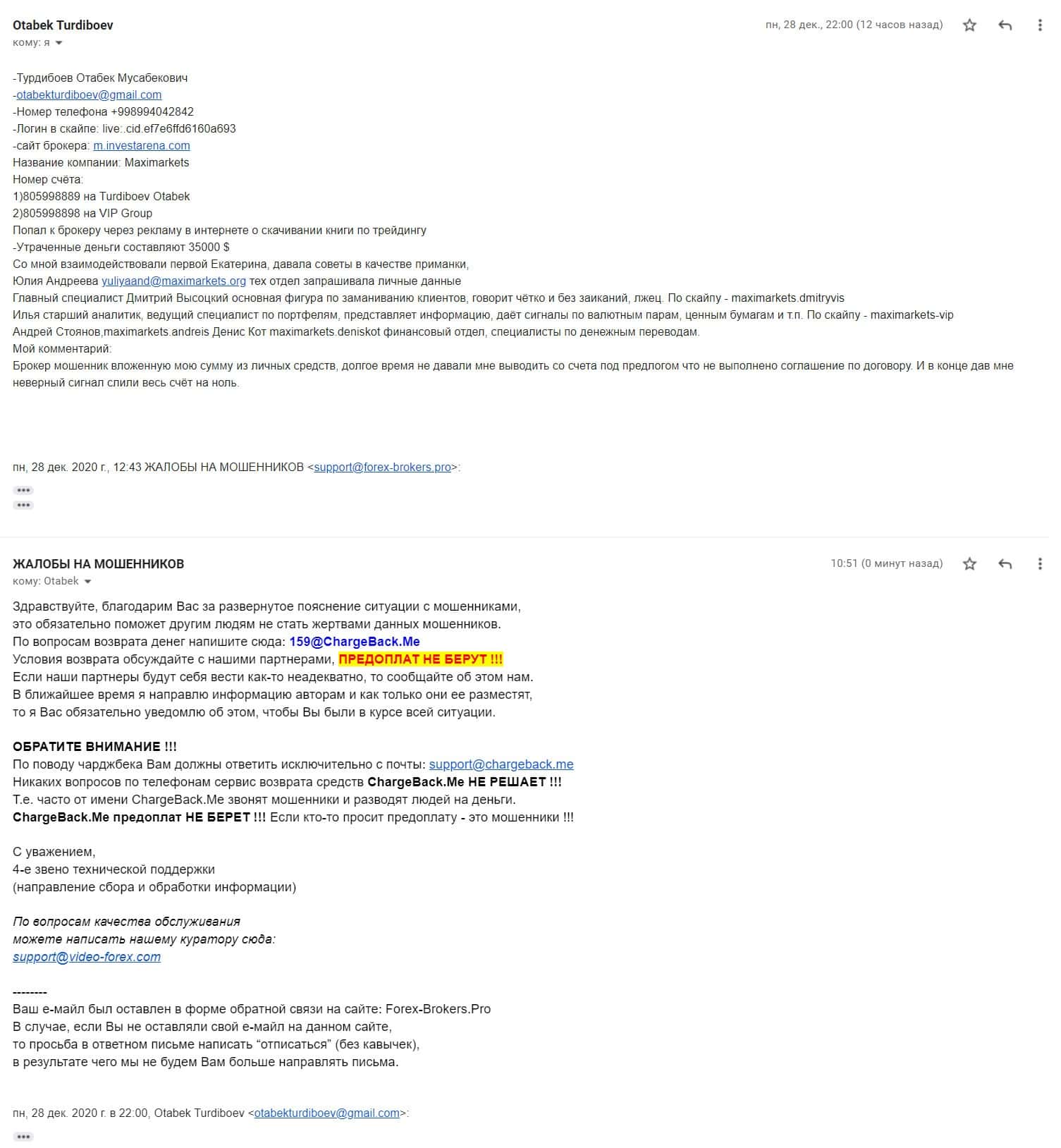 В данной жалобе клиент описал, что форекс-конторы Инвест Арена и Макси Маркетс украли у него огромную сумму денег в размере 35 000 долларов и теперь не хочет выходить на связь.