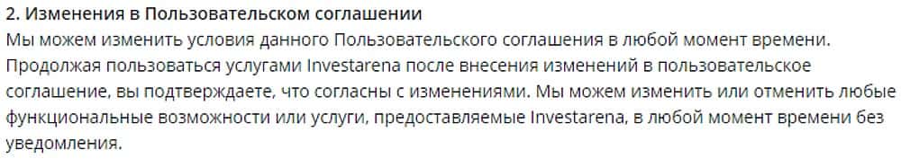 У мошенников Инвест Арена имеется ущербное клиентское соглашение, однако они могут его в любой момент изменять и конечно же уведомлять клиентов об этом они не собираются.