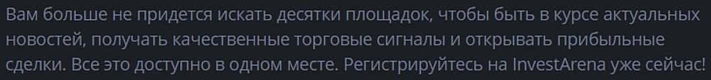 Инвест Арена - обманщики и аферисты! Очередной псевдоаналитический проект-пустышка переливающий своих клиентов в лапы брокеров-мошенников, которых имеется целая сеть: МаксиМаркетс, Тра Дива, MaxiGroups, 770capital, Трейд Алл Крипто, Макси Трейд, SuperBinary, Макси Капитал, Макси Платформ. Если трейдер торгует со своим брокером, то каталы предлагают делать это через их платформу, чтобы поживиться его деньгами. Даже не стоит думать о том, чтобы связываться с убожеством InvestArena, а тем более с их подельниками-разводилами, которые вмиг оставят вас без денег!