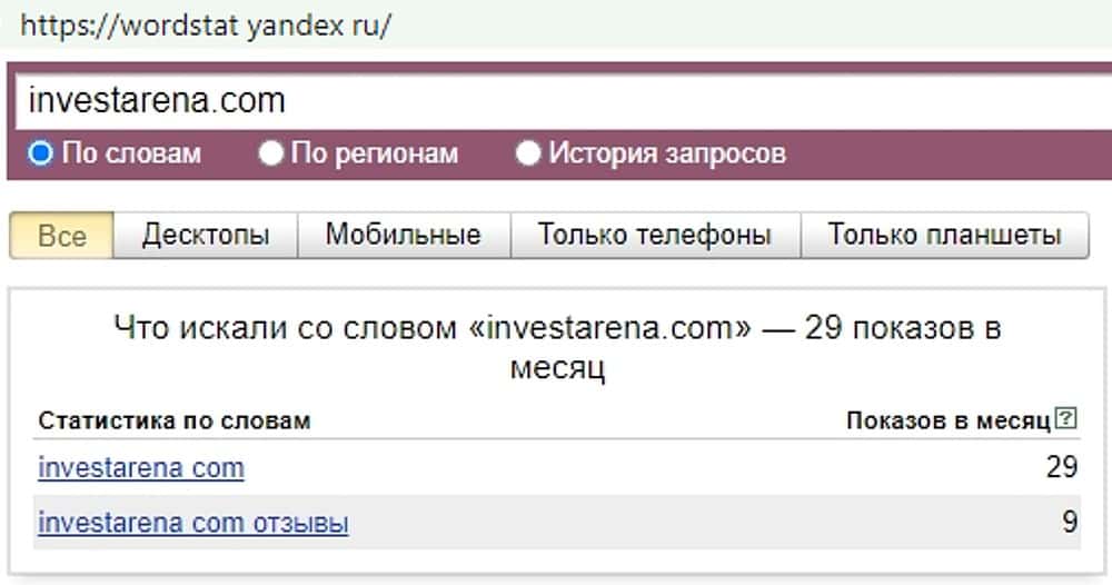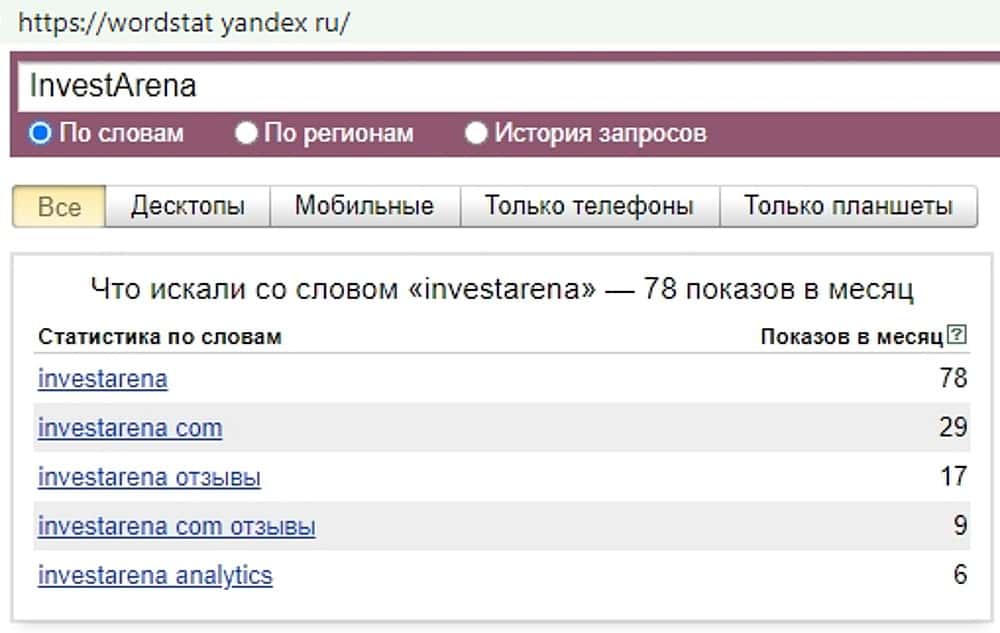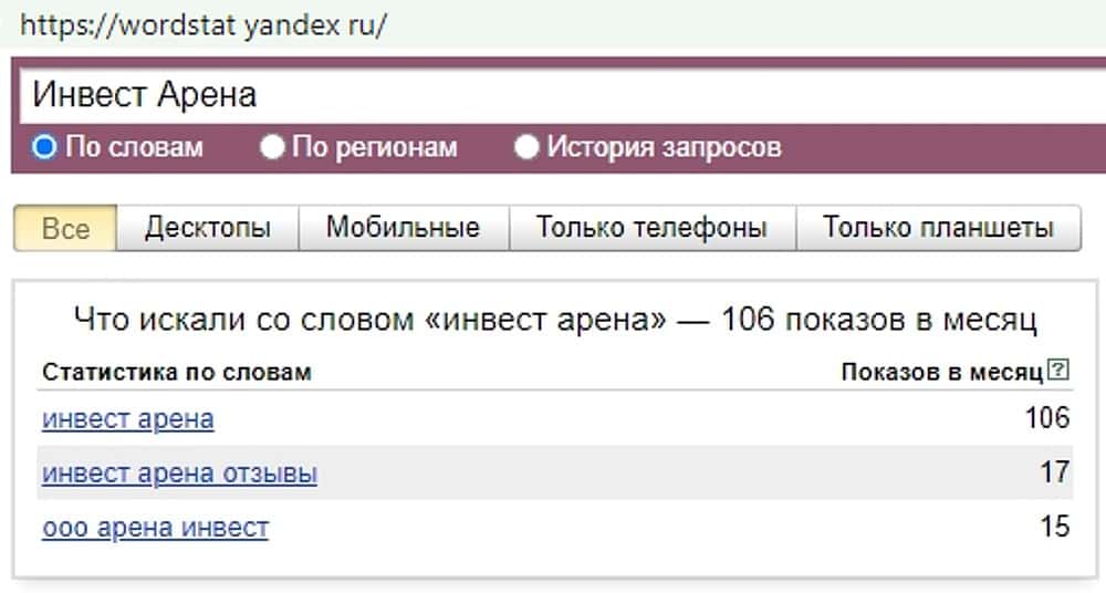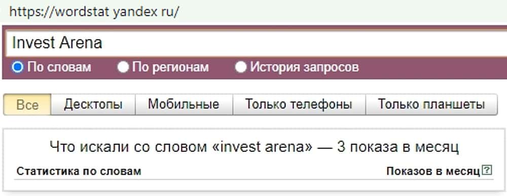 А вот поисковый запрос "Invest Arena" всего лишь три раза побывал в строке поиска сайта Yandex Ru. Обманщиков мало жалуют те, кто предпочитают использовать этот веб-сервис.