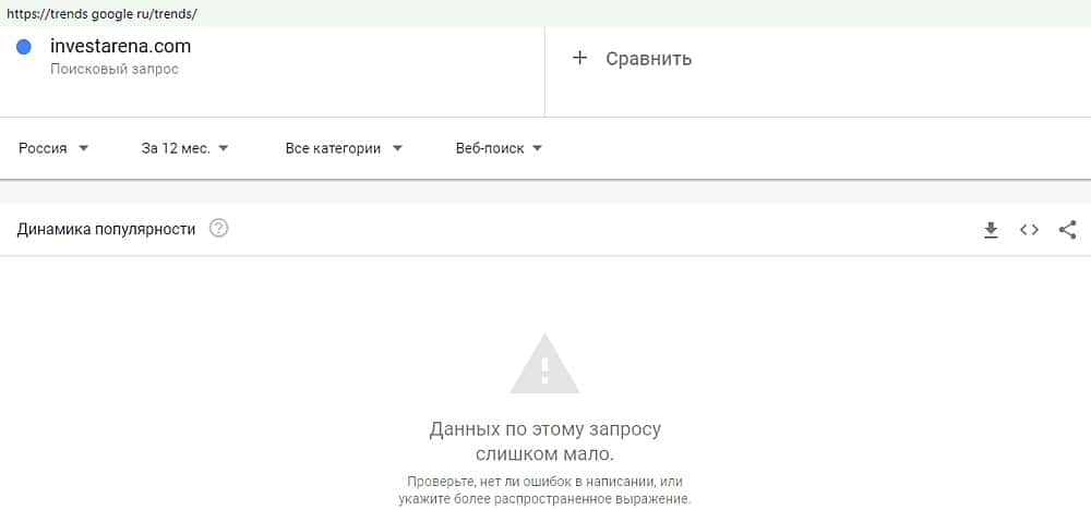 Какая же популярность аферюг среди пользователей поискового сервиса Гугл? Например, их сайт "investarena.com" сто лет никому не нужен, поэтому этот лохопритон никто не искал.