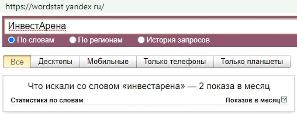 Анализ всех предыдущих запросов не принес результата. То же самое произошло и с проверкой востребованности запроса "ИнвестАрена". Никто не хочет связываться с ворюгами.