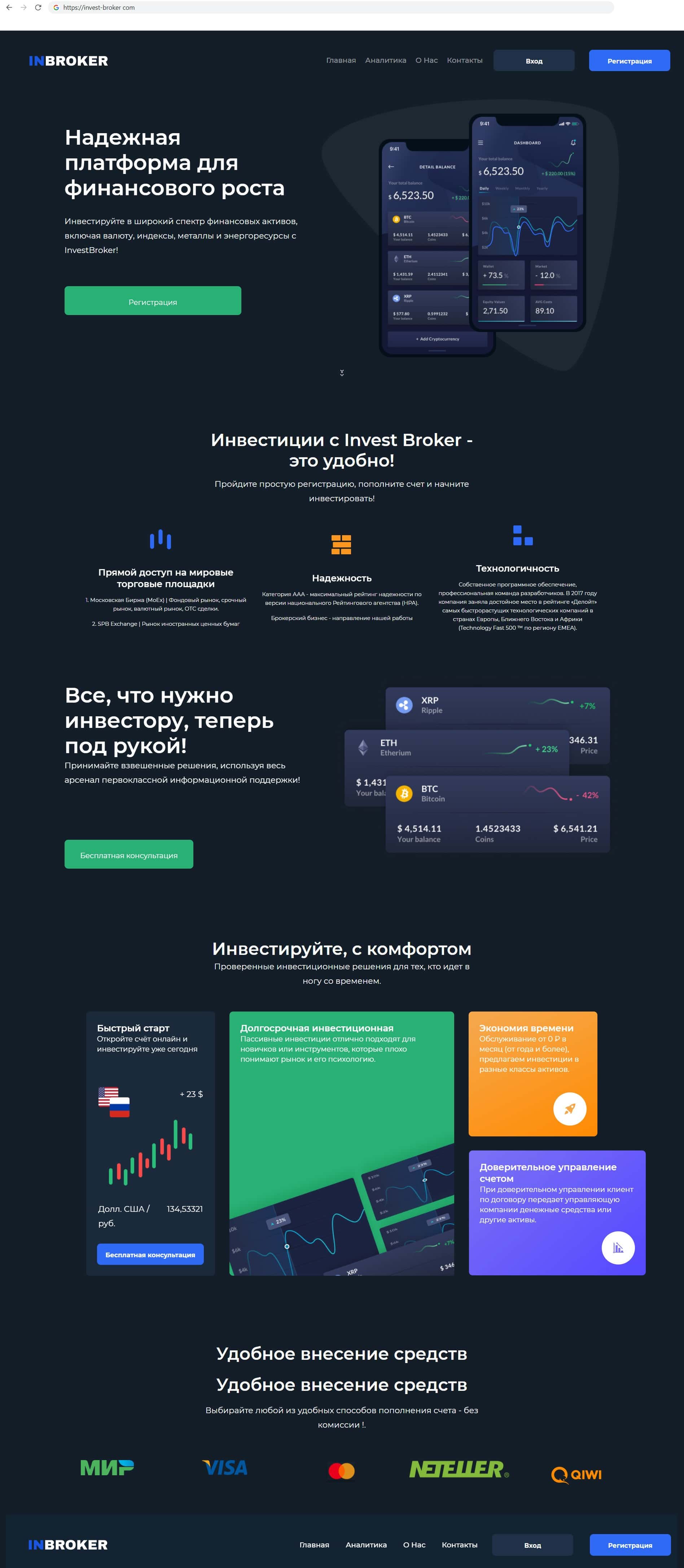 Главный сайт аферистов Invest Broker - IN BROKER даже на вид не вызывает доверия. Это посредственный, дешёвый, шаблонный проект, который служит приманкой для пользователей.