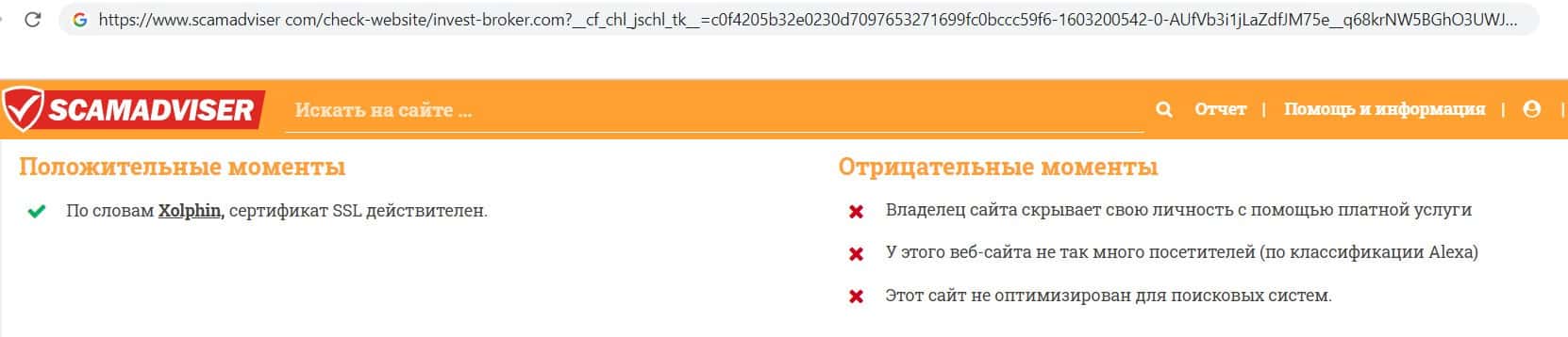 - Мнение интернет ресурса scamadviser com о компании жуликов Инвест Брокер
