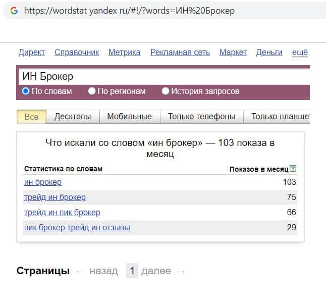 Далее мы проверили запросы компании Инвест Брокер по сокращённому русскоязычному названию фирмы, а именно "ИН Брокер". Данный запрос пользователи совершили 103 раза.