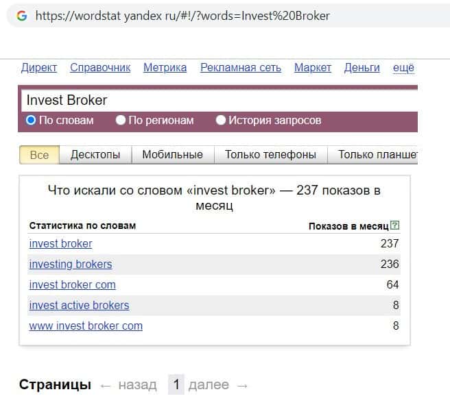 Мы проверили количество запросов компании Invest Broker - IN BROKER в Яндексе по названию фирмы, а именно "Invest Broker". 237 раз пользователи совершили данный запрос.