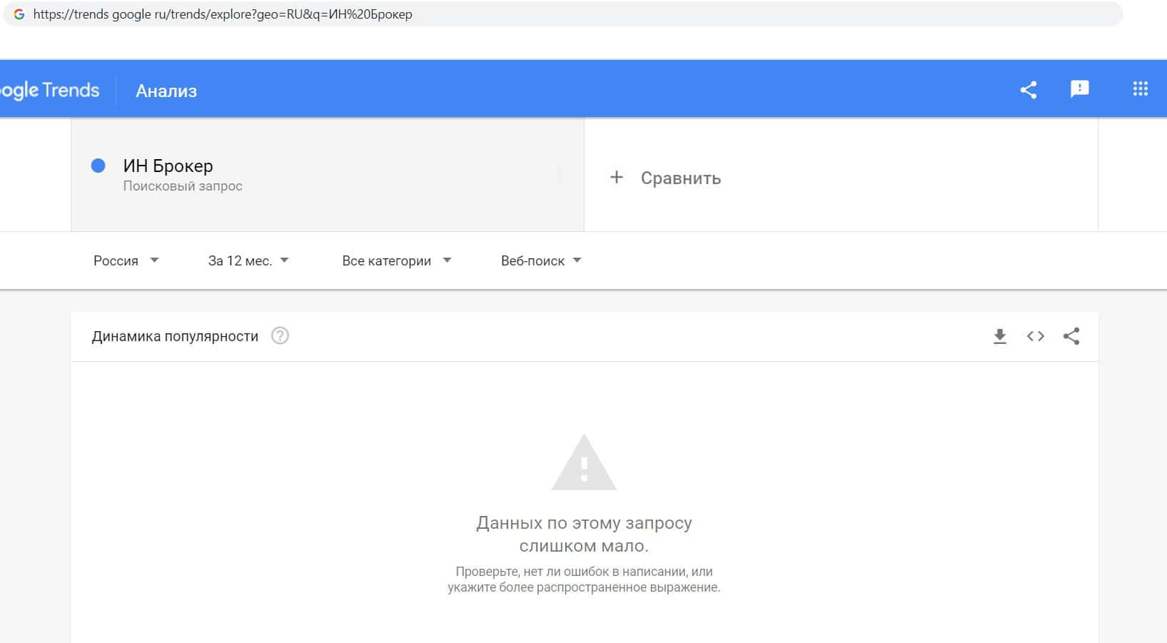 Далее мы проверили количество запросов фирмы Invest Broker - IN BROKER по русскоязычному названию, а именно "Инвест Брокер". Но результат снова - нулевой.