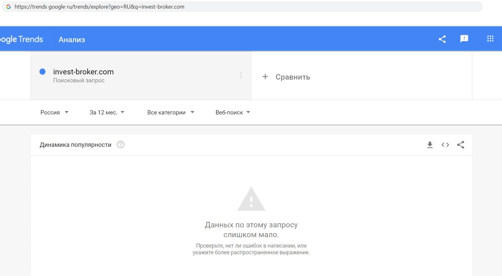 Проверить мы решили и количество запросов компании лохотронщиков Инвест Брокер по домену конторы с точкой, а именно "invest-broker.com". Но результата по прежнему нет.