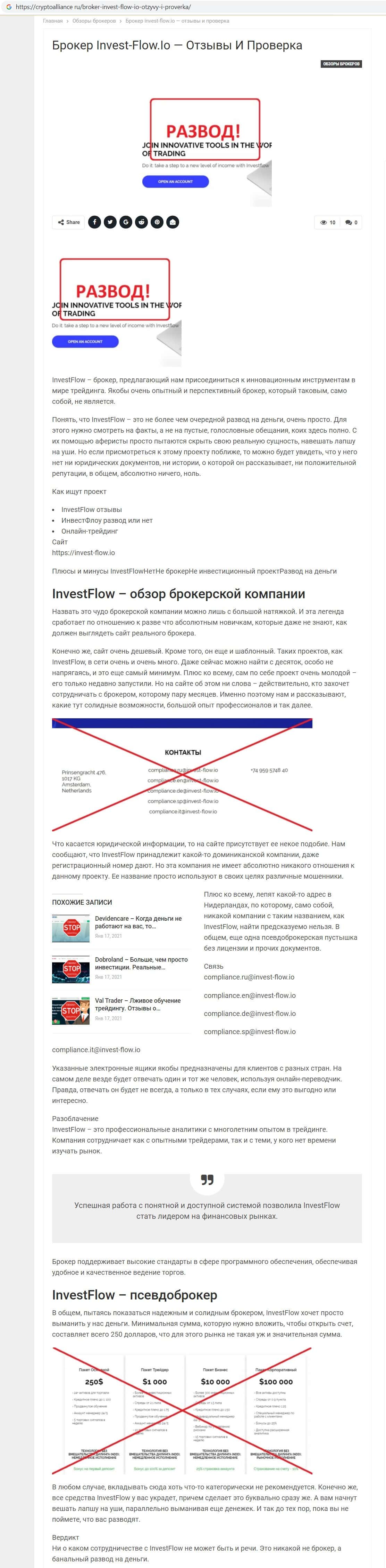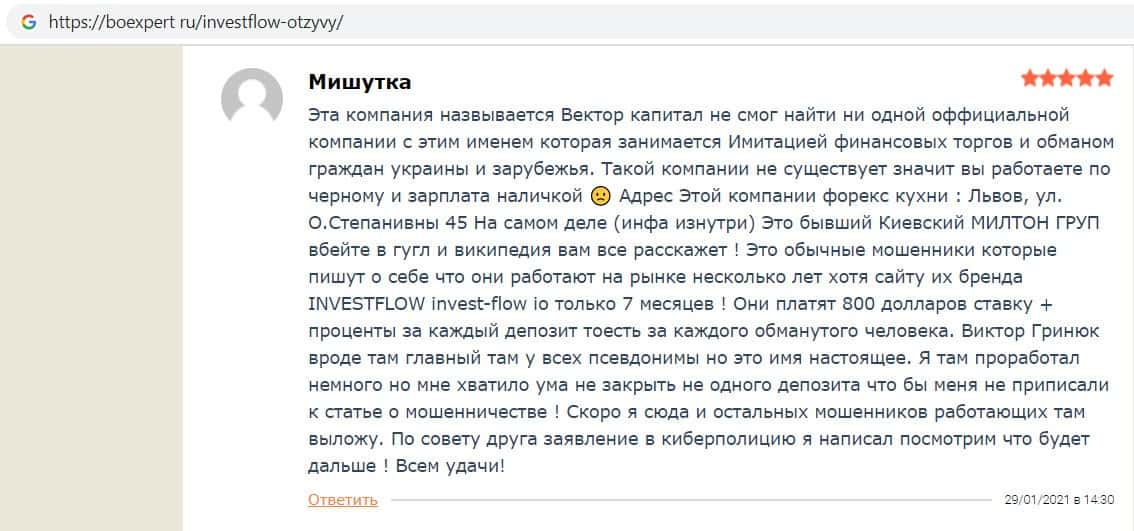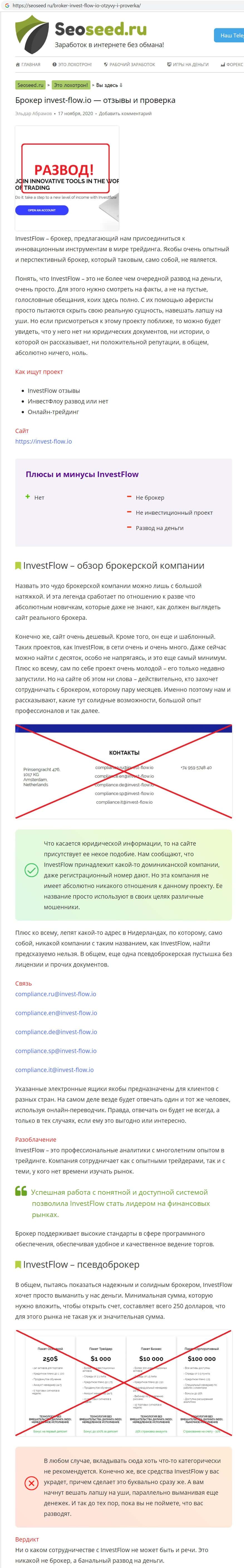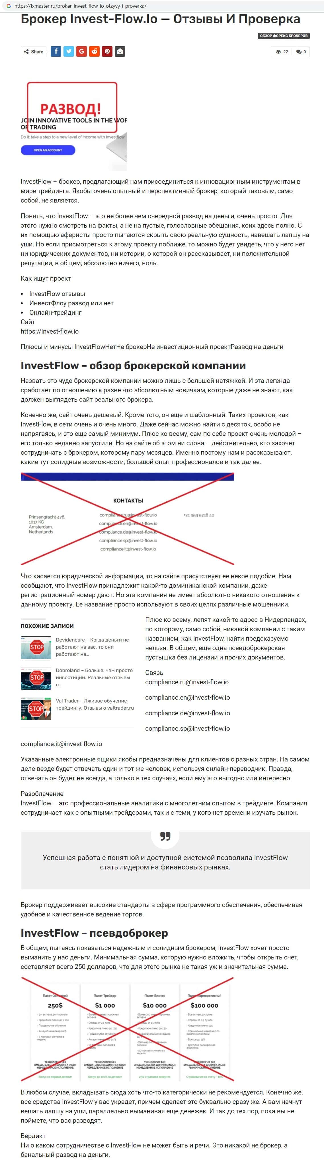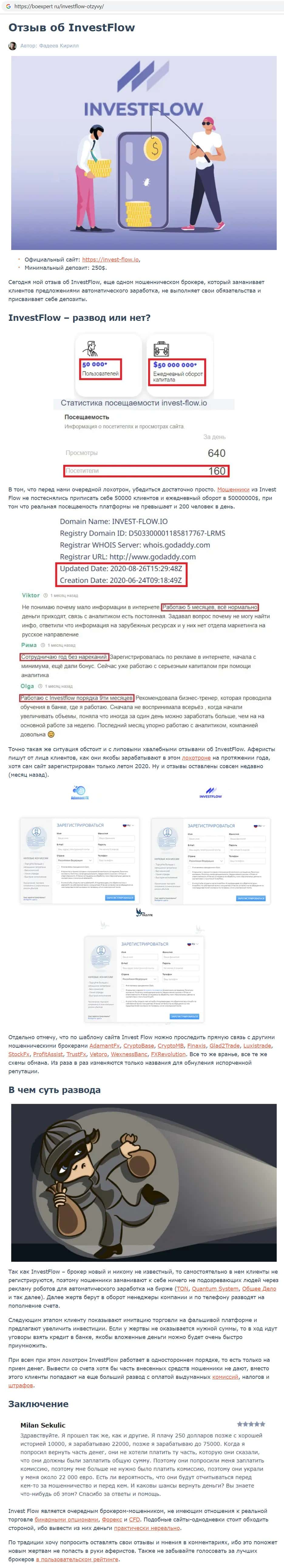 Интернет ресурс boexpert ru опубликовал статью о финансовых мошенниках Инвест Флов, в которой указал, что фирма кидал не имеет никакого отношения к финансовым рынкам.
