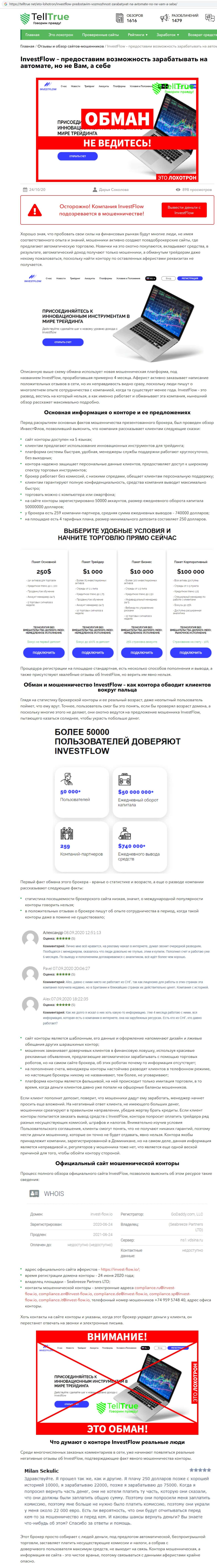 Сайт telltrue net рассказал, что контора Invest-Flow io собирает средства у клиентов под предлогом автоматической торговли, но на самом деле лохотрон всё присваивает себе.