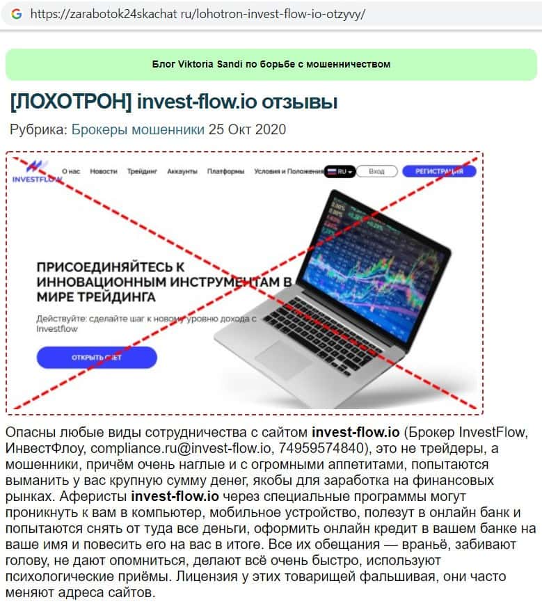 В поисках информации о финансовых разводилах Invest-Flow io мы наткнулись на сайт infoscam ru, который указал, что сотрудничество с данной фирмой грозит банкротством.