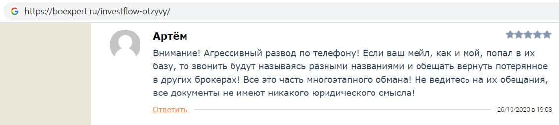 Данный отзыв написал пользователь, который рассказал что мошенники Инвест Флов звонят клиентам и агрессивно требуют денежные средства у пользователей.