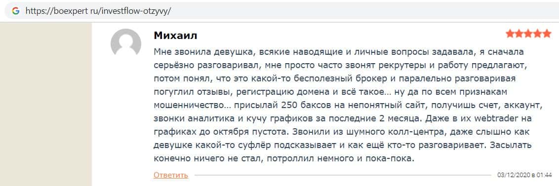 Не остался в стороне и сайт otzyvcom ru, который написал, что Инвест Флов является брокером мошенником, который не имеет отношения к торговле бинарными опционами.