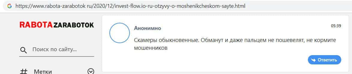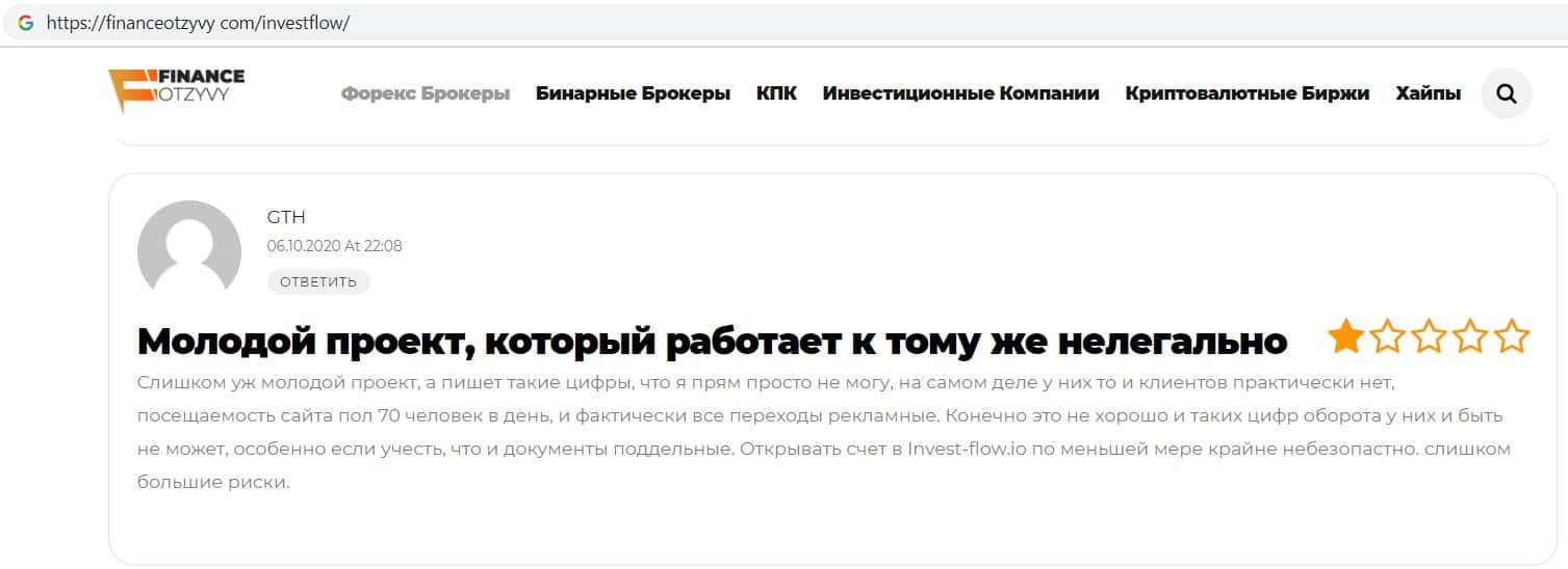 Мы так же нашли статью о аферистах Invest-Flow io на сайте forexareal ru. интернет ресурс написал, что данная фирма является ярким представителей мошенников - однодневок.