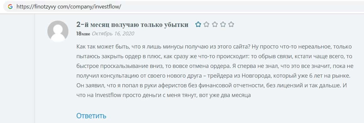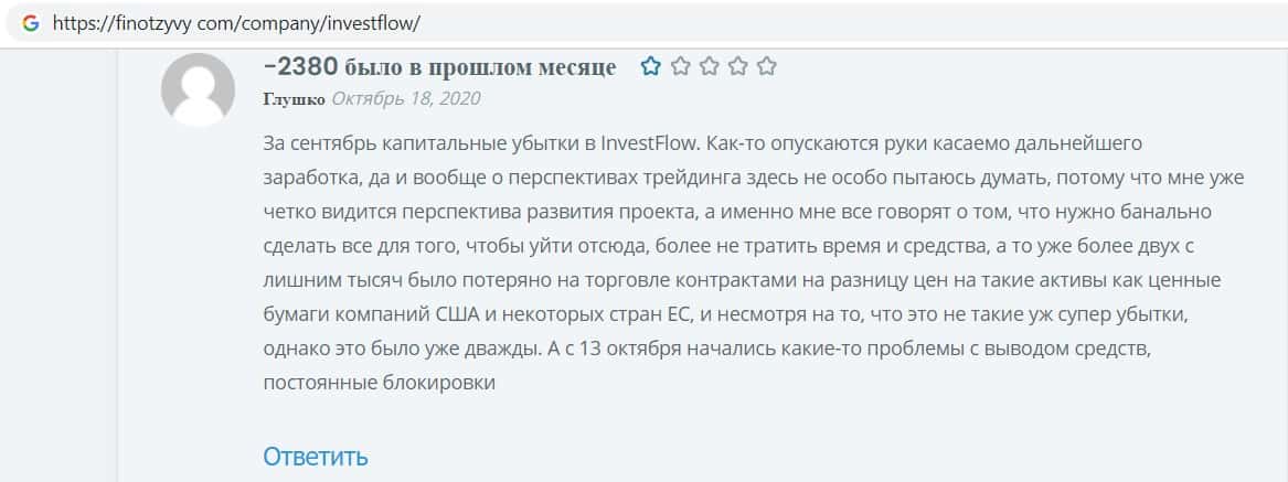 В отзыве о махинаторах Invest-Flow io пользователь сообщил, что в торговле с Invest-Flow io всегда были проблемы, а точнее одни убытки, после чего фирма перестала выводить средства.