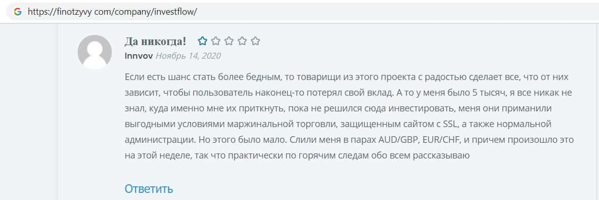 Автор данного отзыва написал, что доверия к финансовым лохотронщикам Инвест Флов не может быть, так как это форекс мошенники, которые врут клиентам на каждом шагу.
