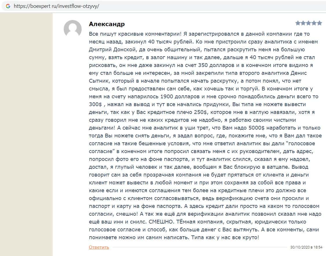 В этом отзыве пользователь написал, что благодаря компании Invest-Flow io он потерял 5000 рублей. Мошенники заманили его выгодными предложениями, после чего кинули.