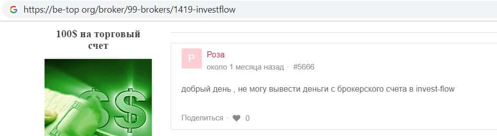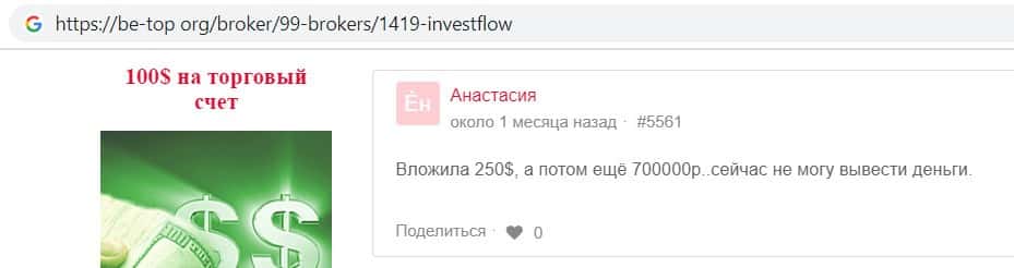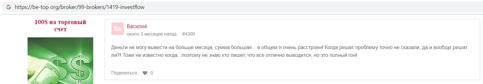 Перед вами отзыв очередного клиента конторы разводил Инвест Флов, который написал, что не может вывести свои денежные средства из данного мошеннического проекта.