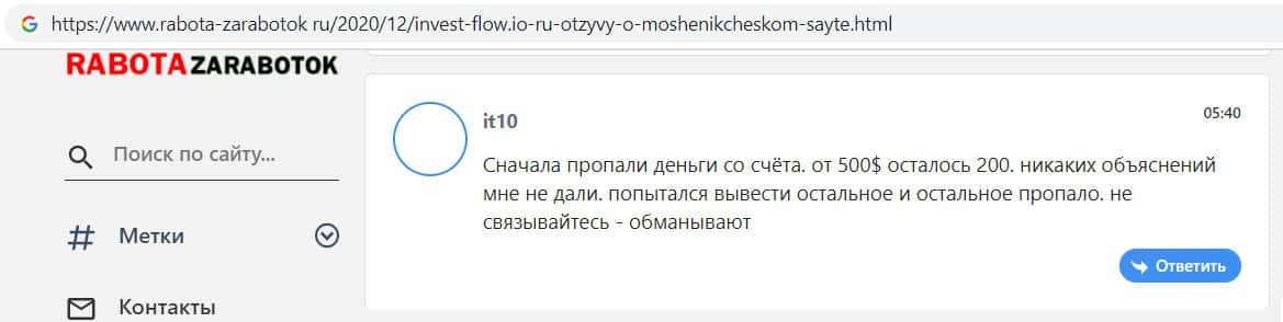 rabota-zarabotok ru - информация о мошеннической фирме Invest-Flow io