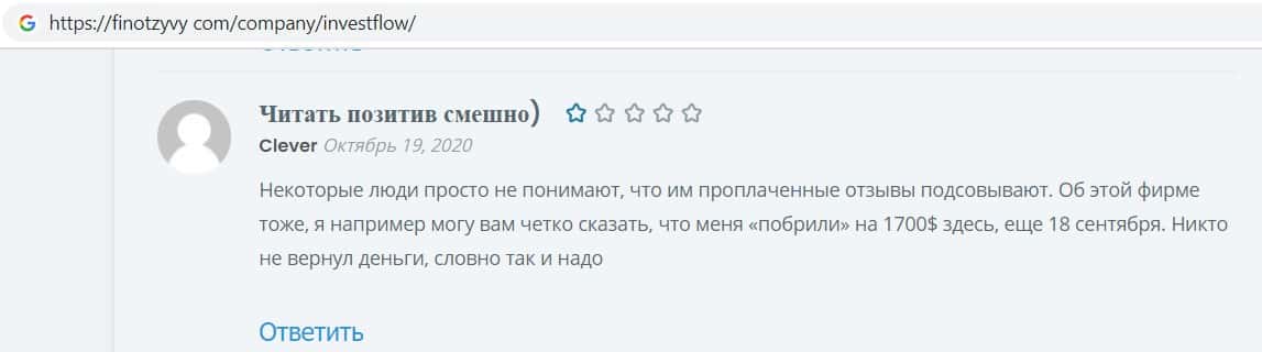 Ещё один пользователь рассказал, что положительные отзывы о Invest-Flow io являются поддельными, так как пользователь стал жетвой кидал, которые отобрали у него 1700 долларов.