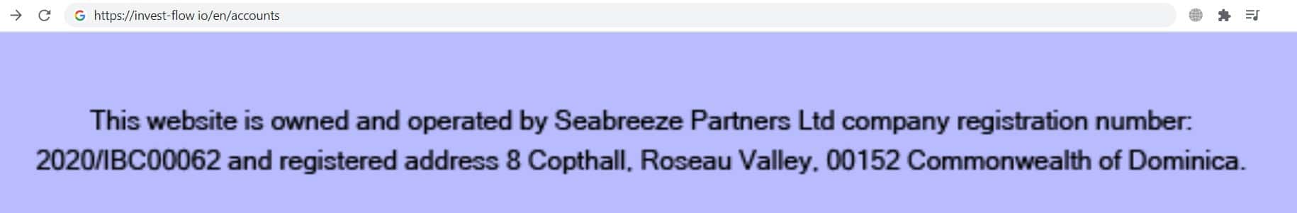 На своём главном сайте контора махинаторов Инвест Флов указала информацию о своём юридическом лице, которым в свою очередь является фирма Seabreeze Partners Ltd.