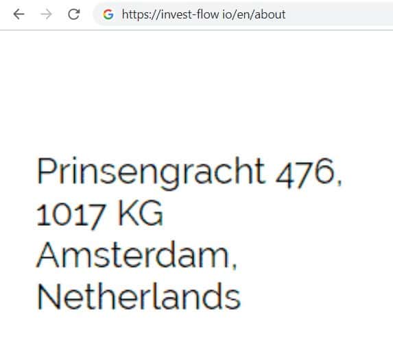 Лжеброкер Invest-Flow io так же указал адрес своего офиса, но на самом деле это фальшивая информация, так как никакого офиса у мошенников нет. Фальшивый адрес кидал: