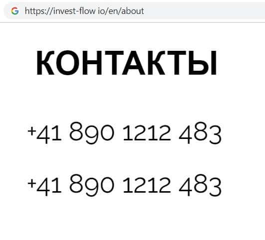 Финансовые разводилы Инвест Флов указали на своём главном сайте контактный номер телефона, с которого сотрудники лохотрона разводят пользователей. Номер махинаторов: