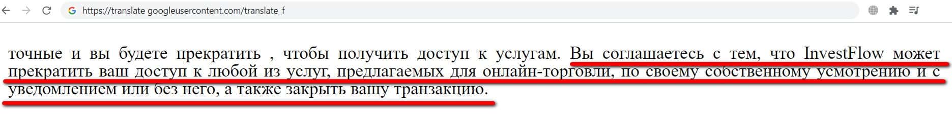 Компания разводил Invest-Flow io в своём соглашении представила пункт, в котором указала, что имеет право отказать клиенту в любой услуге по собственному усмотрению.
