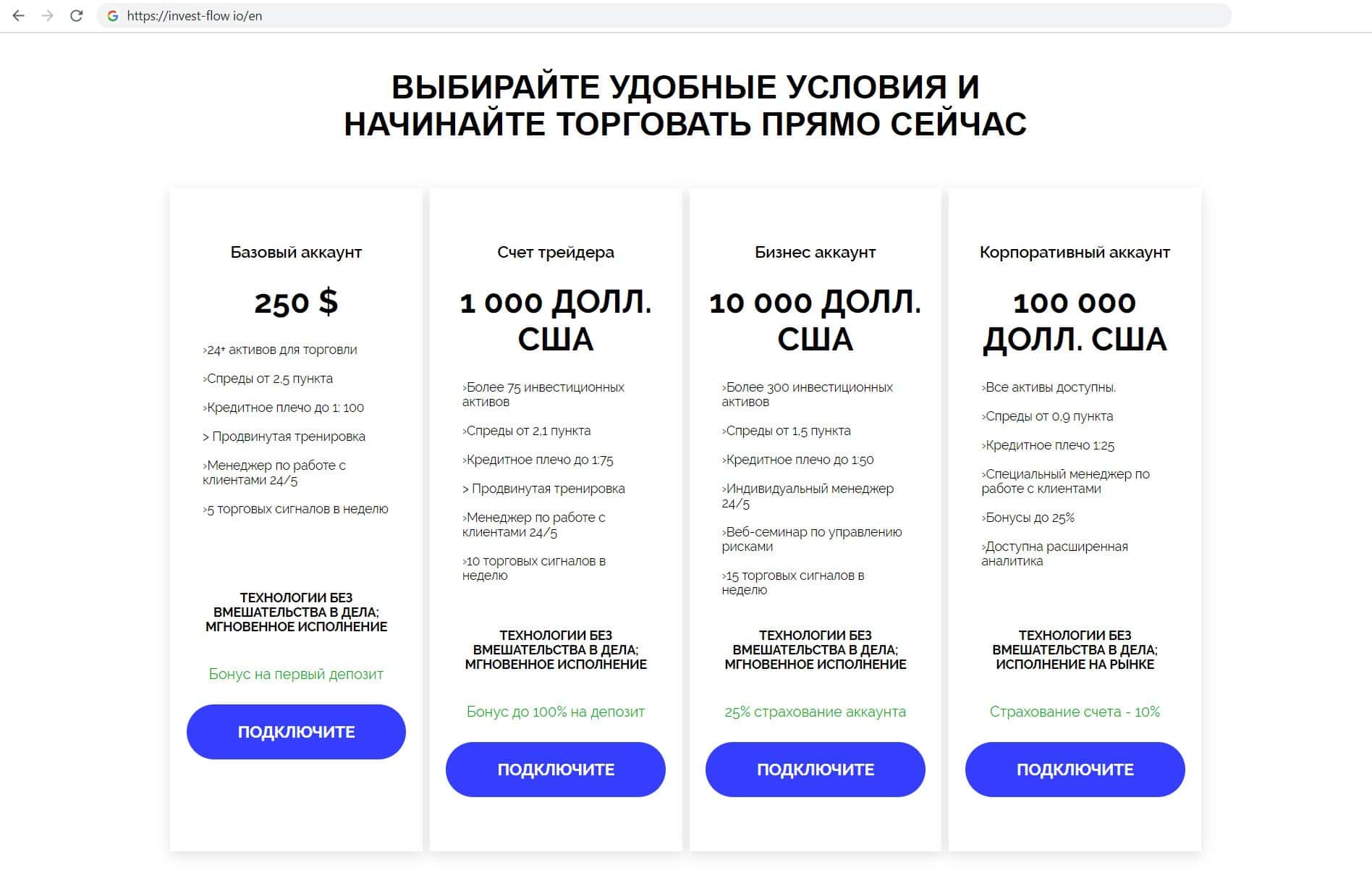 Жулики Инвест Флов представили для выбора несколько счетов, которые отличаются услугами и минимальным депозитом, который варьируется от 250 до 100000 долларов.
