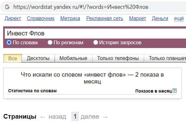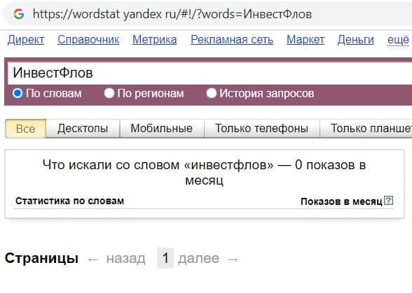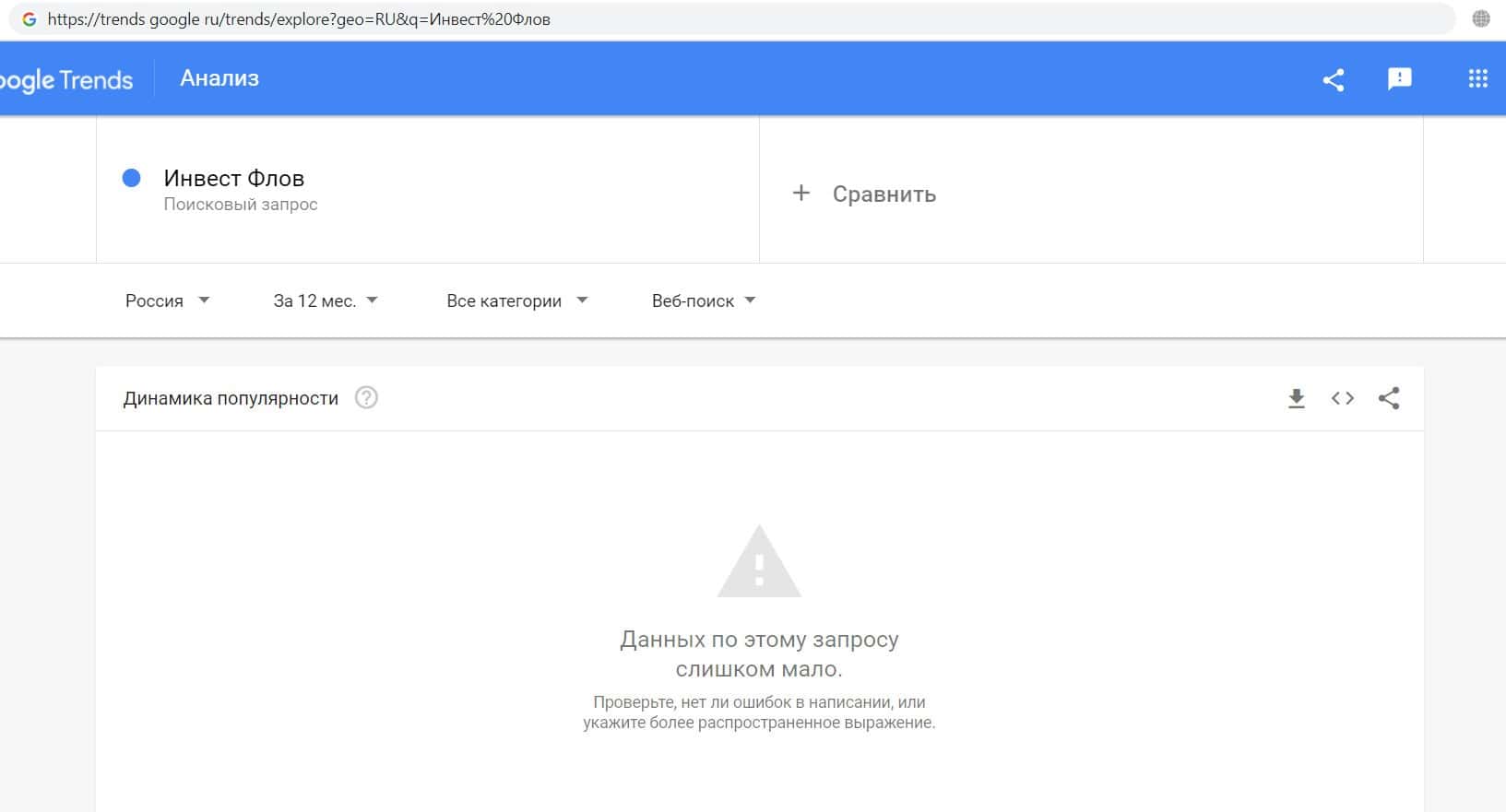 Так же мы проверили количество запросов недоконторы Инвест Флов по русскоязычному названию, но без пробела, а именно "ИнвестФлов", но никто не выполнял данный запрос.