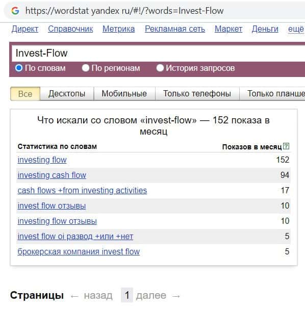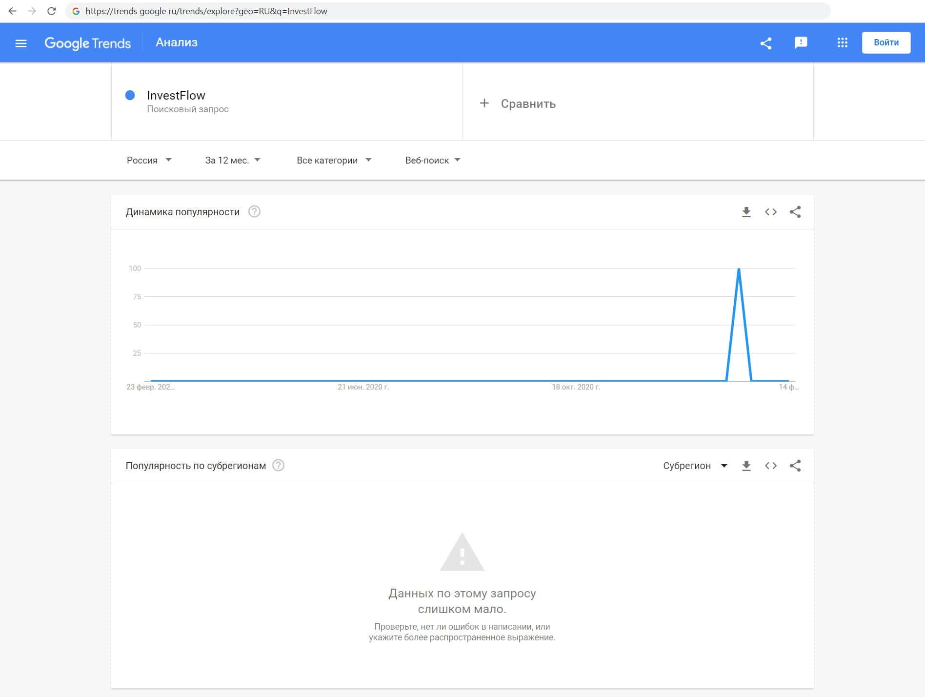 Проверили мы количество запросов фирмы кидал Invest-Flow io по названию конторы, а именно "Invest-Flow". Оказалось, что данный запрос никто не выполнял целой голод.
