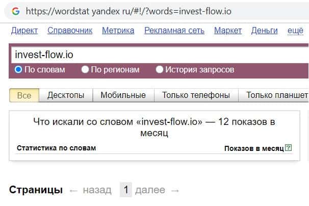 - Количество запросов шарашкиной конторы Invest-Flow io в Яндексе