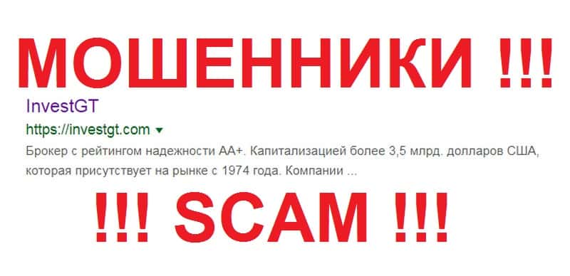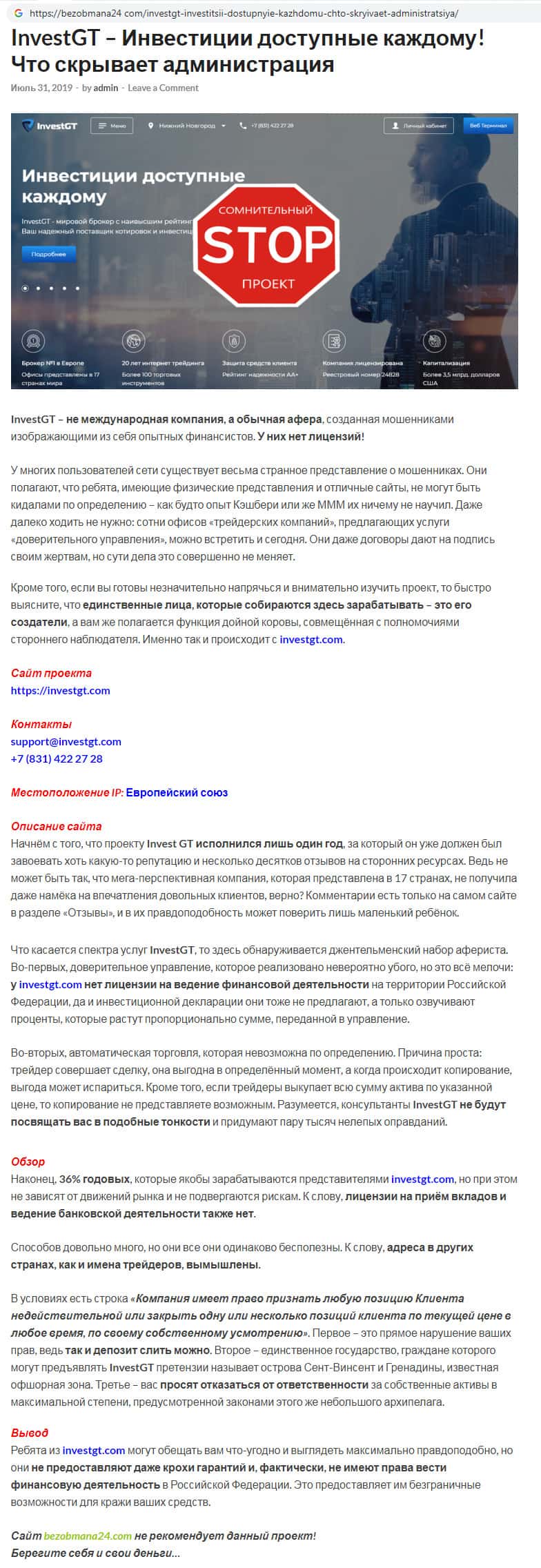 На веб-сайте bezobmana24 com была отыскана статья о мошенничестве брокерской конторы InvestGT, не имеющей лицензии. Шуллера Инвест ГТ обманным путем крадут денежные средства у своих клиентов. А сайт компании липовый. Мошенникам InvestGT нельзя доверять свои денежные средства !!!