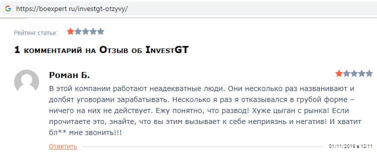 На сайте boexpert ru был найден отзыв от некого Романа Б, который жалуется на работу представителей компании InvestGT. Он считает, что администраторы сайта мошенников - неадекватные люди, не умеющие нормально разговаривать с людьми. С ним по телефону общались в грубой форме и уговаривали вкладывать свои деньги на их счет.