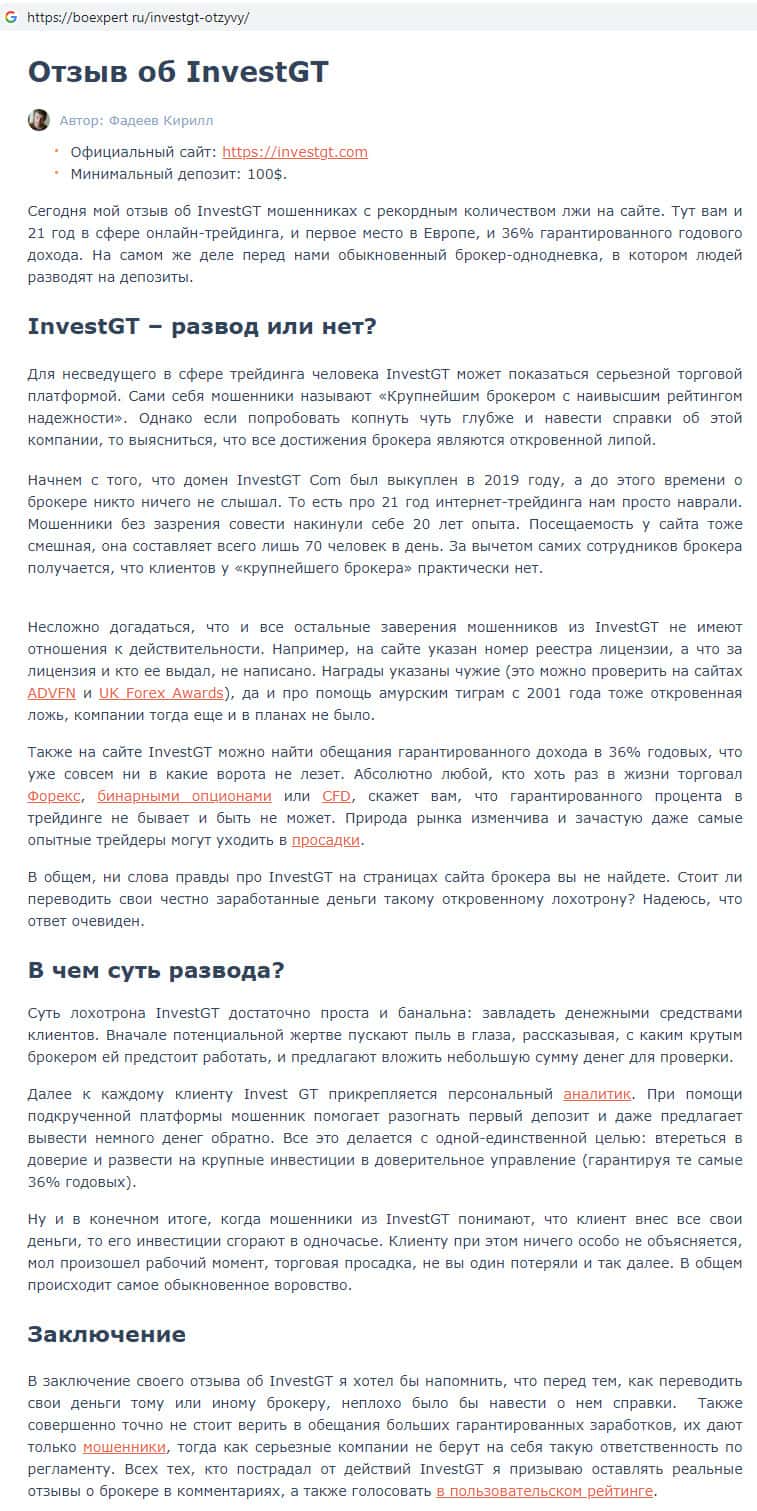 Мошенники компании InvestGT заврались так, что им уже никто не верит. Подтверждением тому выступает ниже представленная статья, которая была найдена на веб-сайте boexpert ru. Автор статьи некий Фадеев Кирилл пишет о том, что у мошенников Инвест ГТ имеется рекордное количество лживой информации на сайте.