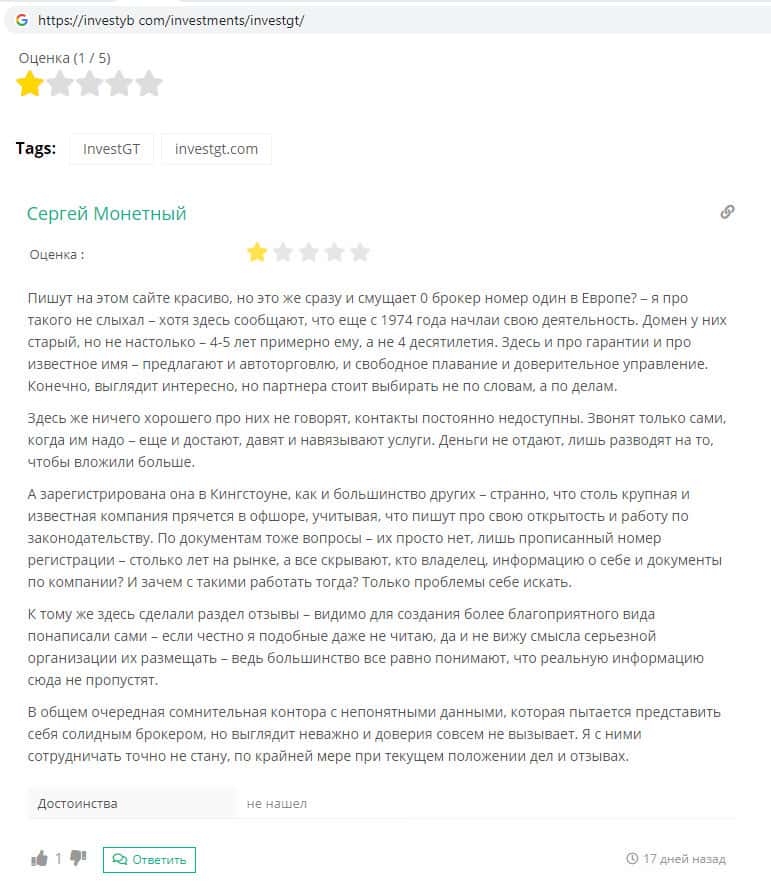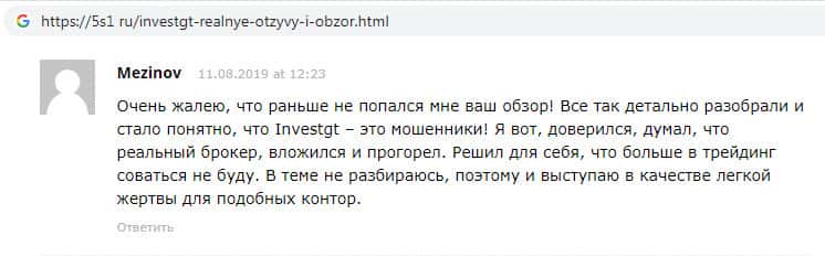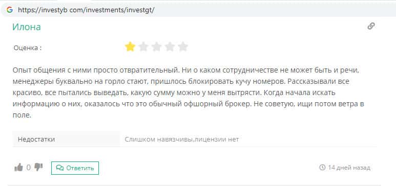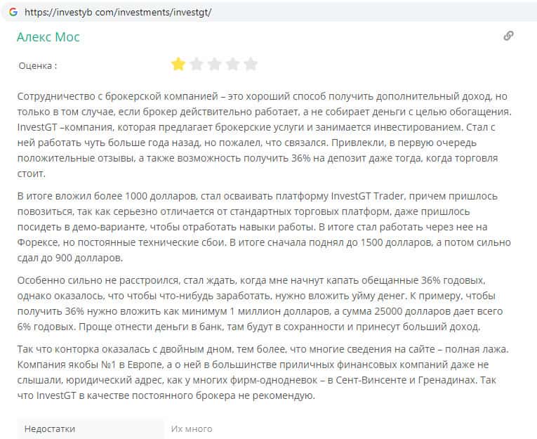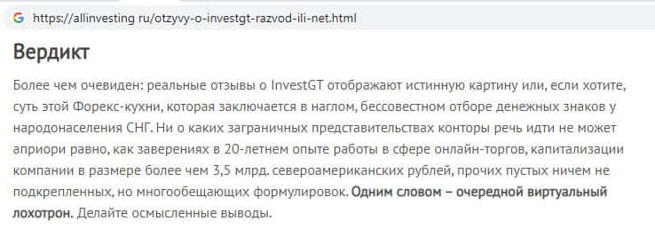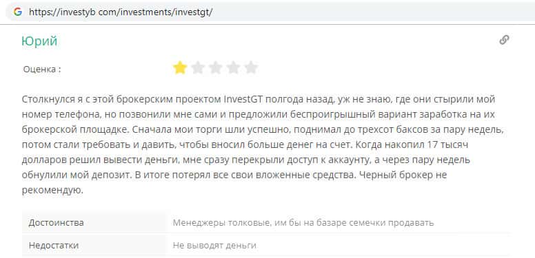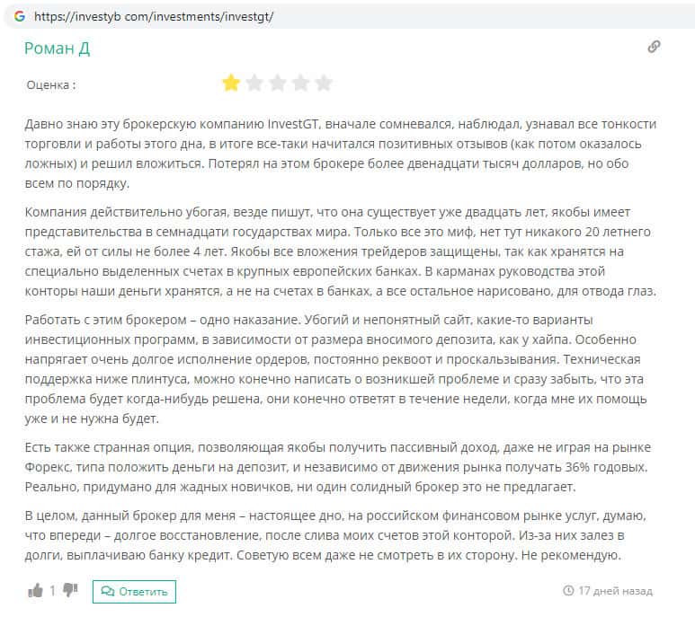 - Отзыв некого Романа о потере денежных средств отыскан на сайте аферистов InvestGT