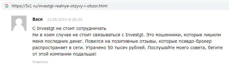 На веб-площадке 5s1 ru был найден еще один отзыв свидетельствующий о том, что сотрудничать с компанией InvestGT не стоит, поскольку информация в позитивных отзывах о данной скам-организации не соответствует действительности. Поверив им, автор данного отзыва утратил 50 тысяч рублей.