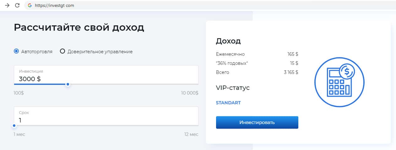 Наличие калькулятора на сайте скам-компании InvestGT - признак финансовой пирамиды