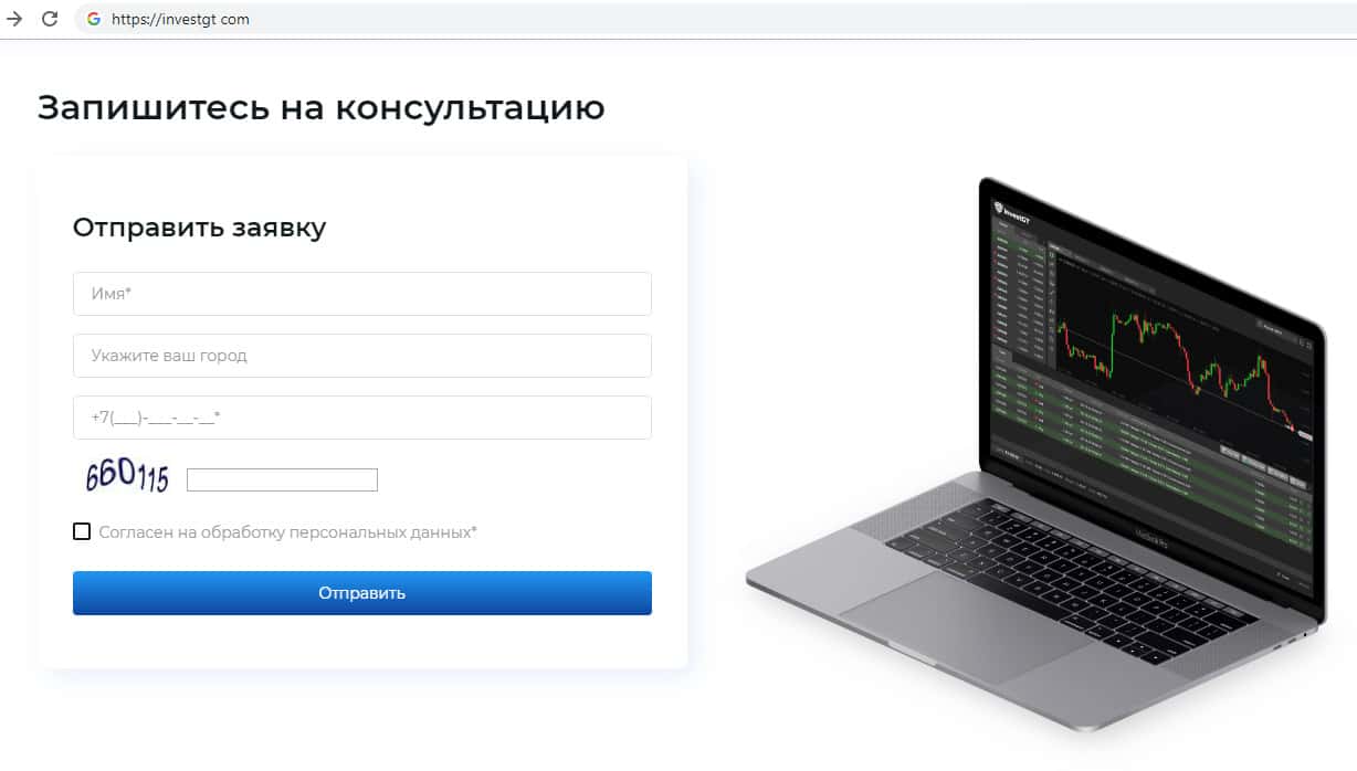 Аферисты Инвест ГТ занимаются сбором личных данных о пользователях, аргументируя это возможностью получения консультации. Для этого мошенники InvestGT предлагают оставить свое имя, город и номер телефона. Ни в коем случае не отправляйте данную заявку !!!