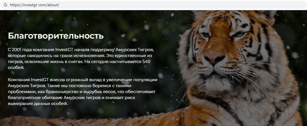 Жулики Инвест ГТ нашли наилучший способ надавить на жалость людям. Для этого мошенники InvestGT разместили на своем официальном сайте изображение с тигром утверждая, что занимаются благотворительностью, а так же борьбой с браконьерством и вырубкой лесов.