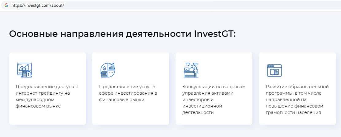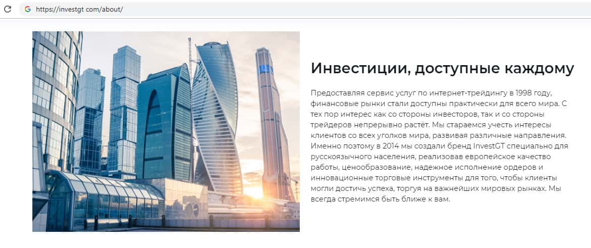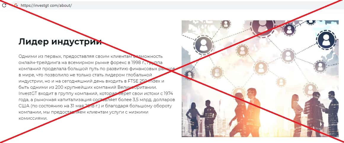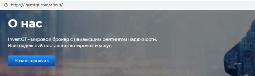 Мошенники InvestGT позиционируют свою контору как мирового брокера с наивысшим рейтингом надежности. Шуллера данной организации мало предоставляют о себе достоверной информации и часто повторяются в формулировках, указывая одну и ту же информацию в каждом разделе сайта.