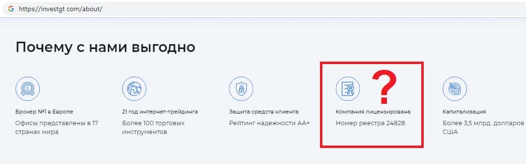 Мошенники InvestGT решили не размещать образец лицензии своей организации. Шуллера оставили только лишь якобы регистрационный номер лицензии компании. Обнаруженная Нами информация не гарантирует надежности брокерской организации InvestGT.