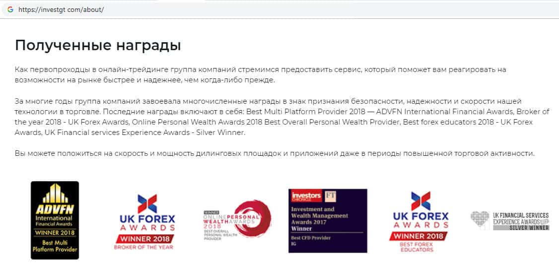 - На сайте скам-организации InvestGT имеются изображения якобы наград компании