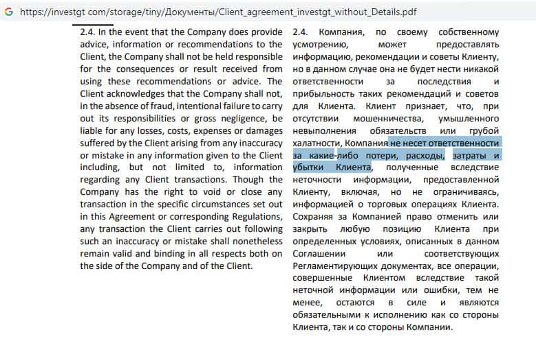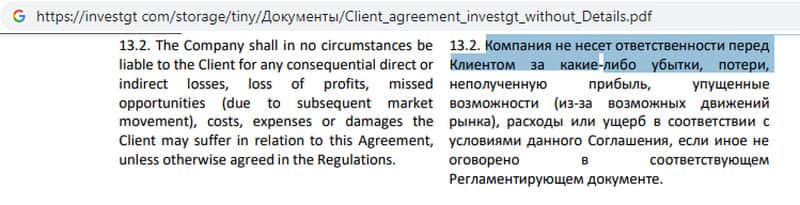 Жулики конторы InvestGT не несут ответственность за убытки и потери клиента на их платформе. Потеряв свои деньги на сайте брокера Вы ничего не докажете, поскольку мошенники заранее прописали данную информацию в клиентском соглашении и в любой момент имеют право менять любую информацию на сайте.