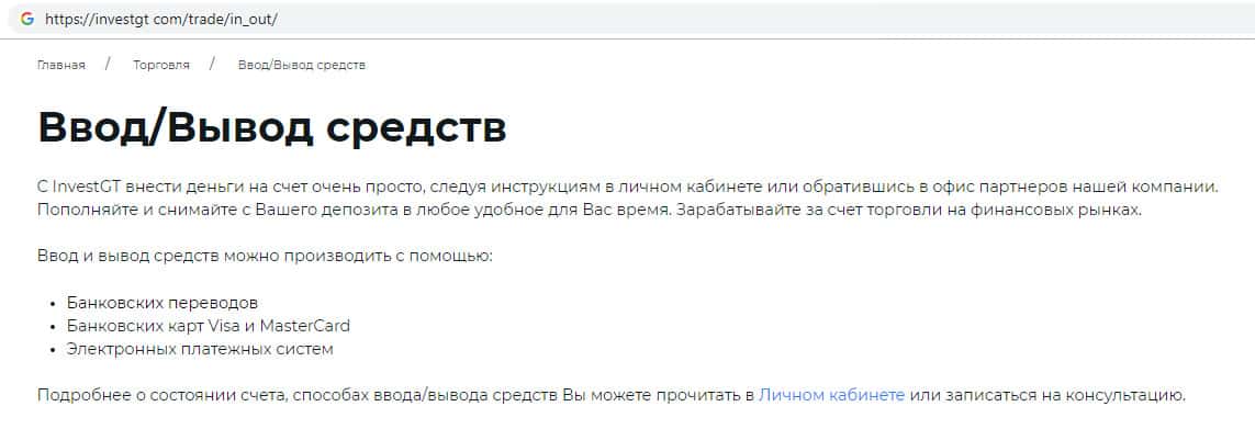 - Краткая информация о выводе денежных средств на сайте скам-брокера InvestGT