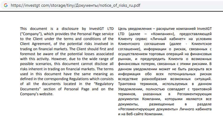 Информация о всевозможных рисках обнаружена на сайте скам-брокера Инвест ГТ