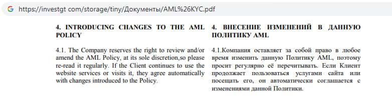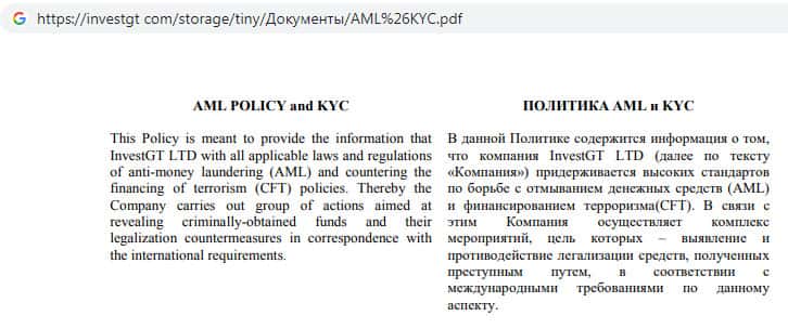 Скам-контора InvestGT много рассказывает о том, как придерживается высоких стандартов, в том числе и по борьбе с отмыванием денежных средств. Таким образом мошенники Инвест ГТ создают видимость надежности своей организации для того, чтобы люди им больше верили и отдавали вкладывали свои деньги в счета компании.
