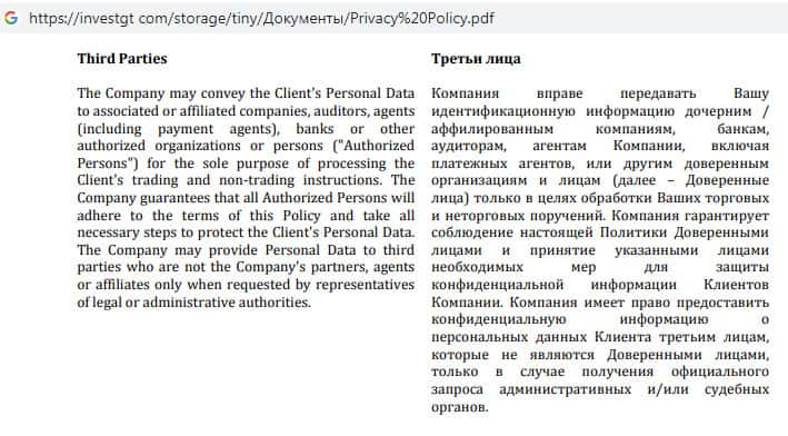 Политика конфиденциальности на официальном сайте скам-организации InvestGT
