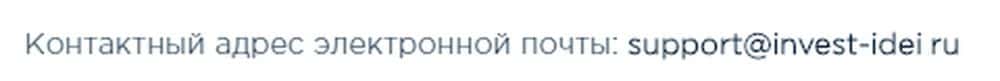 Контактов мошенники Invest-Idei Ru почти никаких не предоставляют. Видимо, чтоб жертвы их не донимали жалобами. Нет ни номера телефона, но адреса шараги, известна только почта: